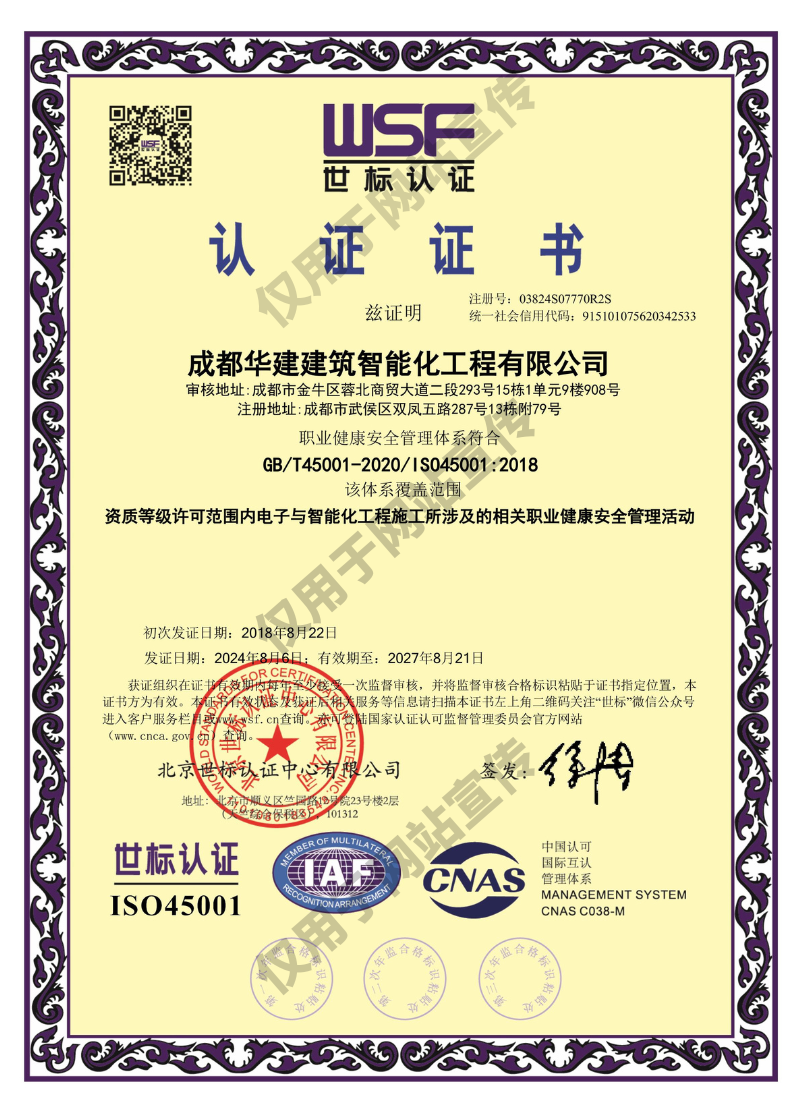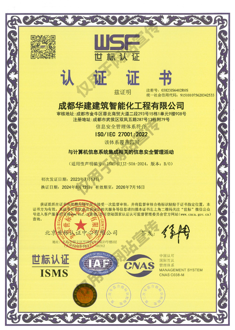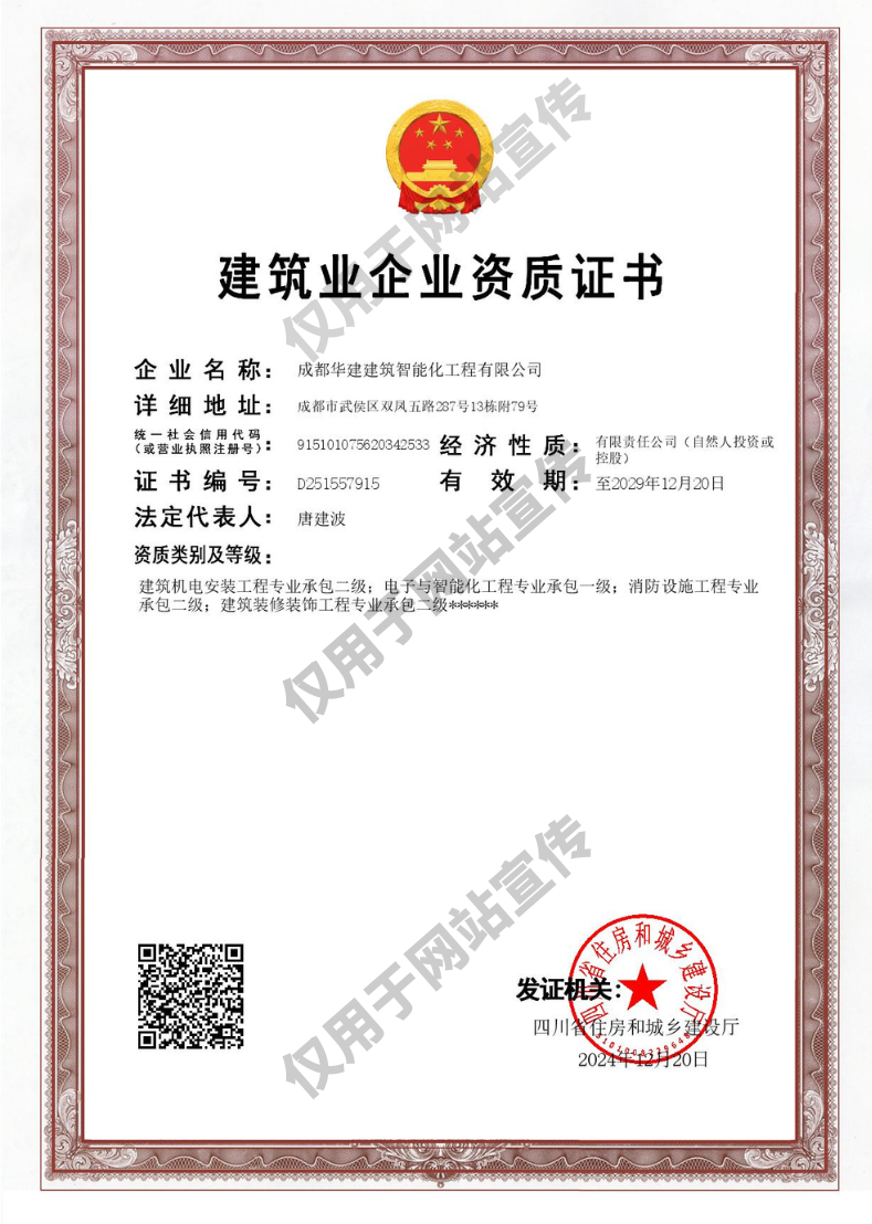 成都華建建筑智能化工程有限公司,19年專注弱電智能化工程、消防工程、建筑機(jī)電安裝工程的專業(yè)公司,具備電子與智能化工程、消防設(shè)施工程、建筑機(jī)電安裝、建筑裝修裝飾、建筑智能化設(shè)計等相關(guān)30余項資質(zhì)及證書。設(shè)計、施工和維保一站式服務(wù),多行業(yè)中大型成功交付案例。…